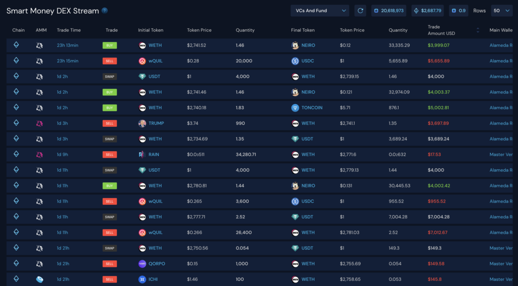 With Alphanomics’ Smart Whales Tab, you gain access to real-time insights into the DEX (Decentralized Exchange) transactions conducted by smart whales. This feature provides you with a live view of: